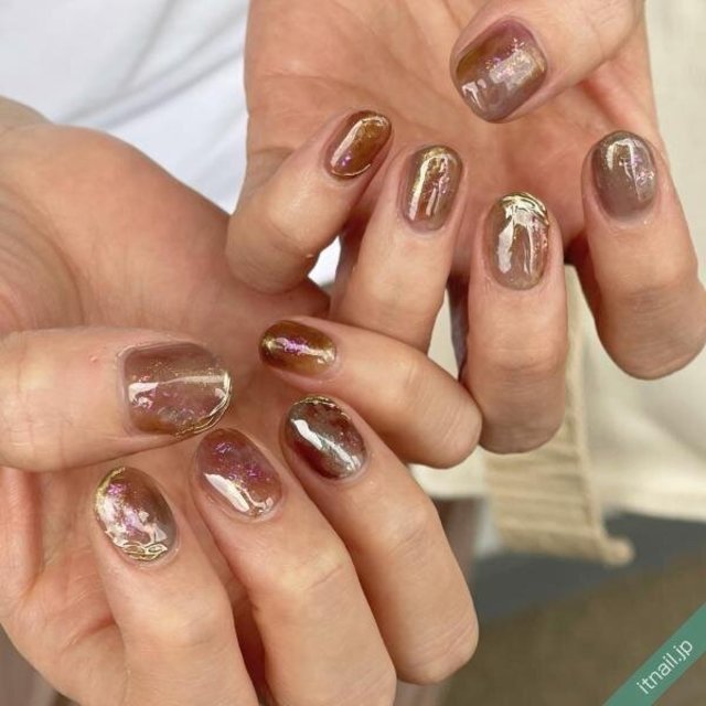 奥行きのあるシアーカラーはトップコートでしっかりとツヤを出して、瑞々しさを強調するのがポイント。まろやかなカーキとブラウンのニュアンスアート、アンニュイなゴールドのラインが秋の景色を連想させてくれます。