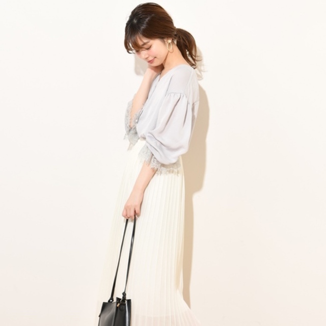 補色のイエロースカートを合わせることで、お互いの色が引き立って見えます。