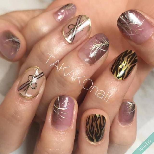 クリアベースで、淡いホワイト系のカラーをランダムにのせたデザイン。ラフに見えておしゃれなネイルです。