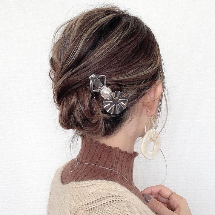 ちょっと今っぽいルックスに仕上げたいなら、低めお団子をサイドで作るのもおすすめです。ふんわりとした髪の質感がフロントからも見えるので顔回りのアクセントにもなります。