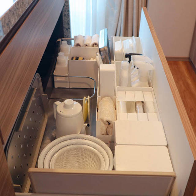奥行きが短いとその分手が届きにくくなりますよね。手前の方に洗剤などを置けるので棚の奥行きの長さに気を付けましょう。