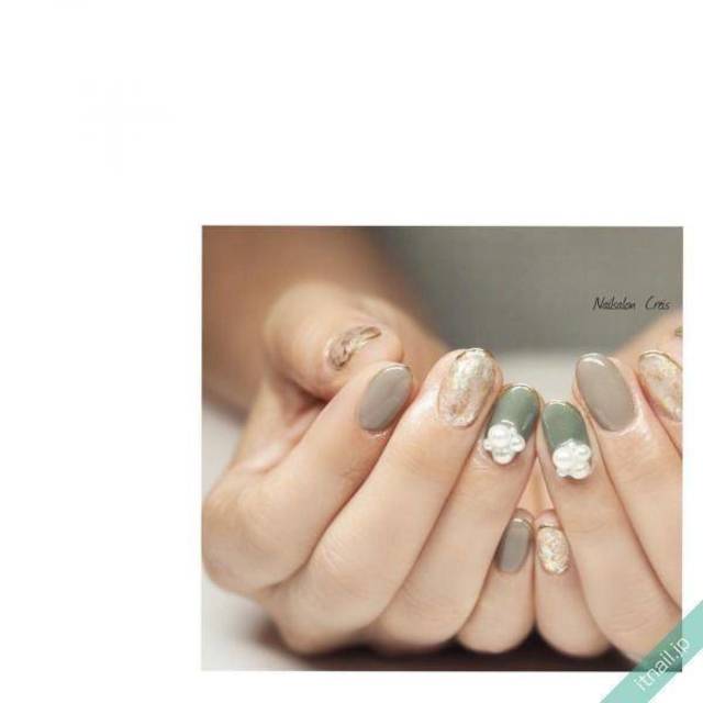 ランダムにホイルをのせてさりげなく大人のきらめきを放つ手元に。メタリックで一見華やかなホイルですが、洗練されたホワイトベースなので都会的な印象になりますね。