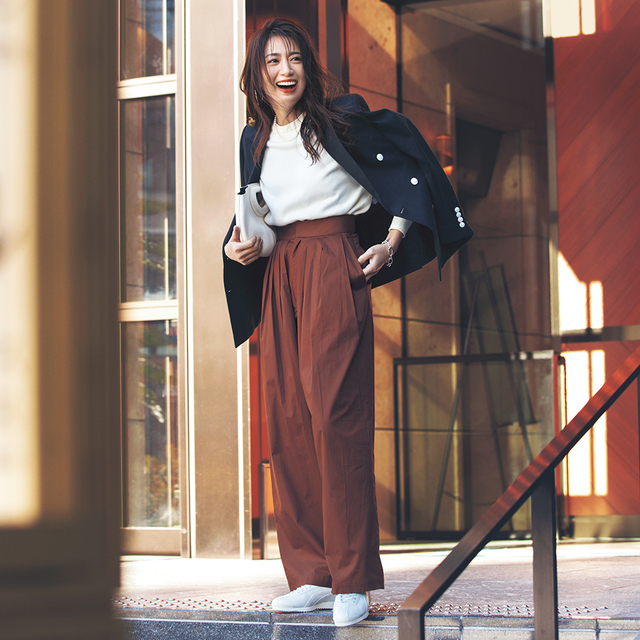 ブラウンのクロップトワイドパンツに袖コンシャストップスを合わせた旬コーデ。Vネックが女性らしさを引き立てます♡