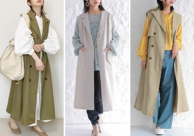 (左)シンプルなベージュも縦長シルエットですっきり。前を開けて着て。