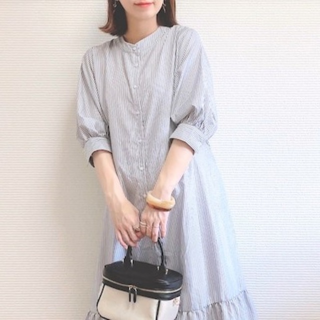 上品ネイビーのワンピースにベージュのサッシュベルトで大人のスタイリングに。夏らしいアイテムを合わせることで、季節感を忘れないトレンドコーデに仕上げたお手本スタイリングです。
