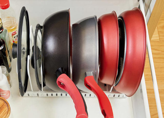 とくに、コンロ下が引き出しという人には「フライパンスタンド」で収納する方法がおすすめ。幅を調整できるフライパンスタンドなら、余分なスペースがなくなってその分たくさん収納できます。