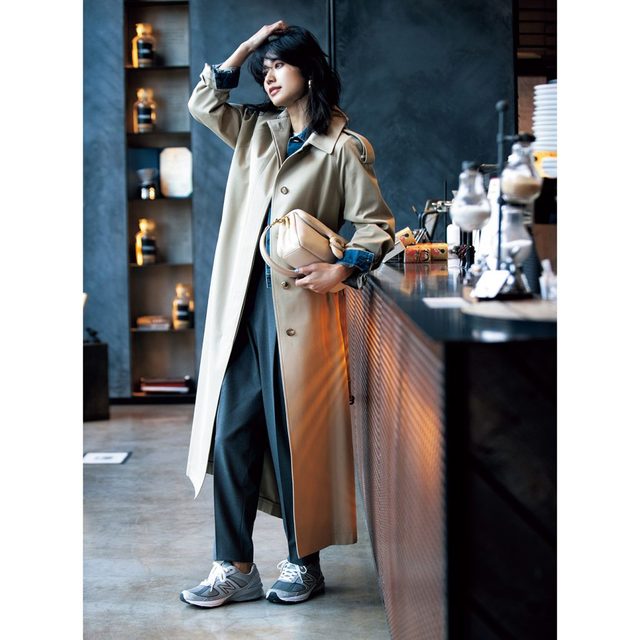 コーディネートがかぶりがちなトレンチコートスタイルは、ボトムで変化を付けると◎。真っ白なワイドパンツは、エレガントで大人なコーディネートを演出してくれます。