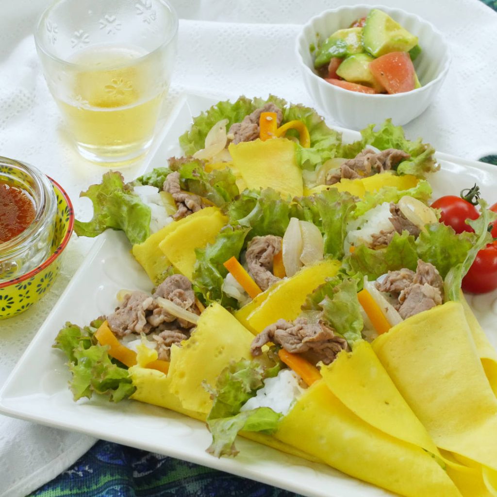 「薄焼きたまごの手巻きビビンバ」のレシピと作り方を動画でご紹介します。手巻き寿司といえば海苔!ではなく、色鮮やかな薄焼き卵で巻きました。甘辛味の牛肉と野菜を入れて、特製コチュジャンだれをたっぷり付けて召し上がれ♪