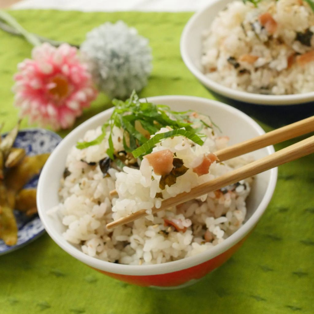 乾燥わかめは細かく砕いて入れると、水で戻す手間が省けます。梅干しを丸ごと入れて炊き込むので形崩れせず、混ぜたときにふわっと香りが広がります。お茶漬けにしてさっぱりと食べるのもおすすめですよ♪
