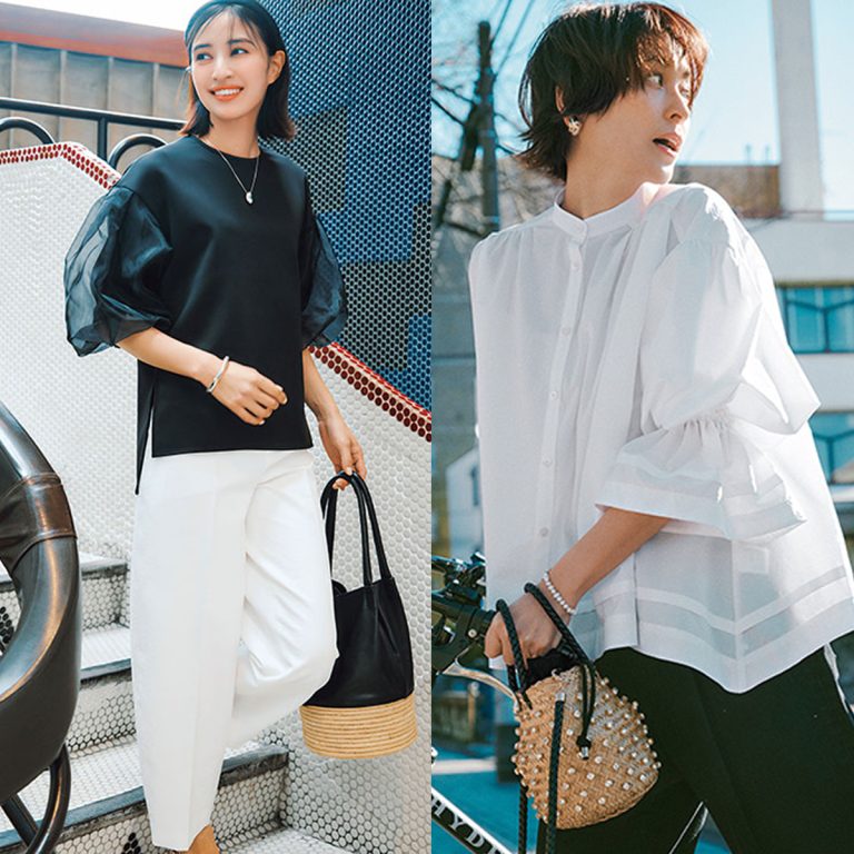 白のカットソーと黒パンツのシンプルなスタイリングも、サテンの艶の効果で洗練された印象に。ラフにまとめたお団子ヘアも、コーデとマッチしていて素敵ですね。