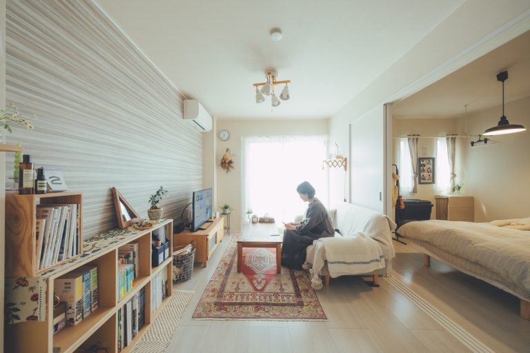 ①カラーボックスにマスキングテープを貼り、収納する物ごとにペンで文字を書きます。マスキングテープをカットする時に、あえて手でちぎって“こなれ感”を出すのがポイントです!