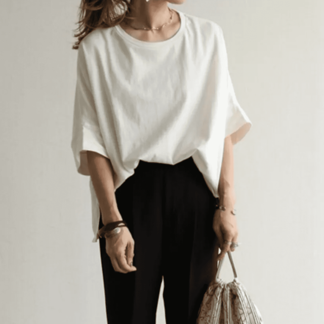 肩が気になる人は、肩を隠しつつすっきり見せるのがポイント。ビックサイズでゆったり感を出しつつ、首周りはVネックでシュッとした印象に。