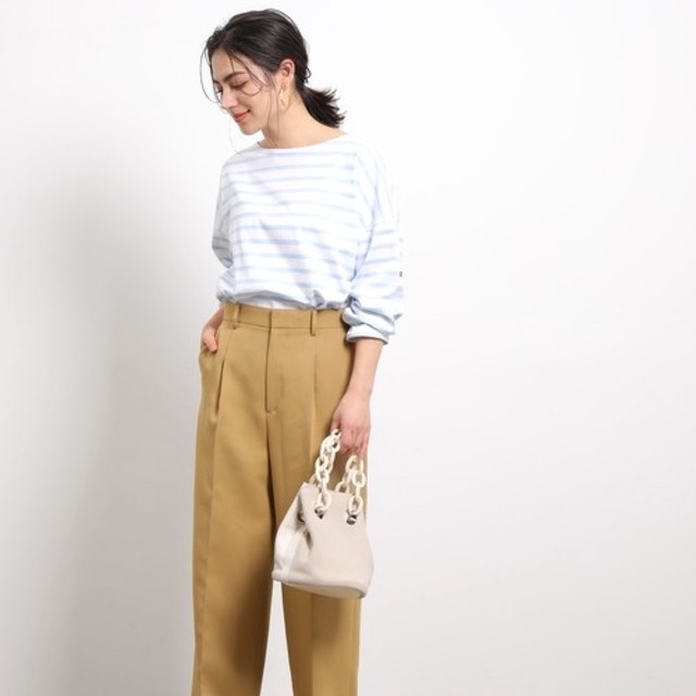 スカートスタイルに合うスッキリとしたシルエットのニット。ボートネックがデコルテラインを綺麗に見せてくれます。程よい透け感が女性らしい。