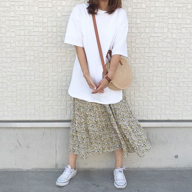 シンプルで使いやすいキャンバストートバッグです。スカートスタイルでもカジュアルさをプラスすると親しみやすいお洒落な雰囲気になります。白×紺の組み合わせは季節を問わず合わせやすい色ですね。