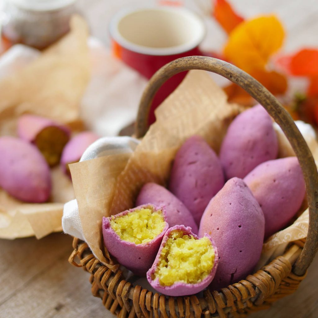 さつまいもあんがパサついている場合は、牛乳を少しずつ加えて丸めやすい固さに調整してください。あんを包む際にクッキー生地が割れてしまう場合、指でよくなじませるときれいに包めますよ♪
