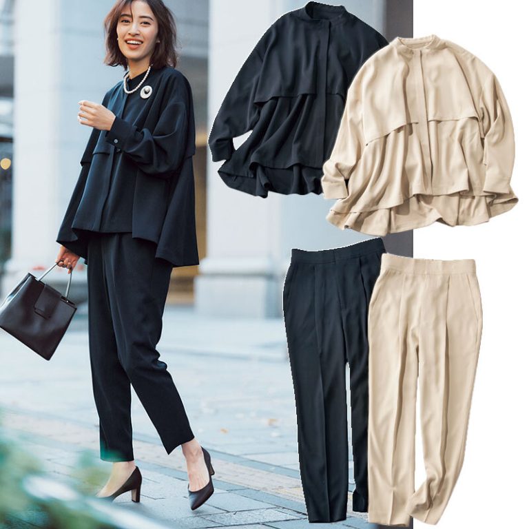 楽ちんでもきれいめに見えるアイテムなので、動きやすいオフィスコーデとしても◎。モノトーンでまとめると上品な雰囲気に。裾スリットで足捌きも良く、長めの丈でもだらしなく見えません。