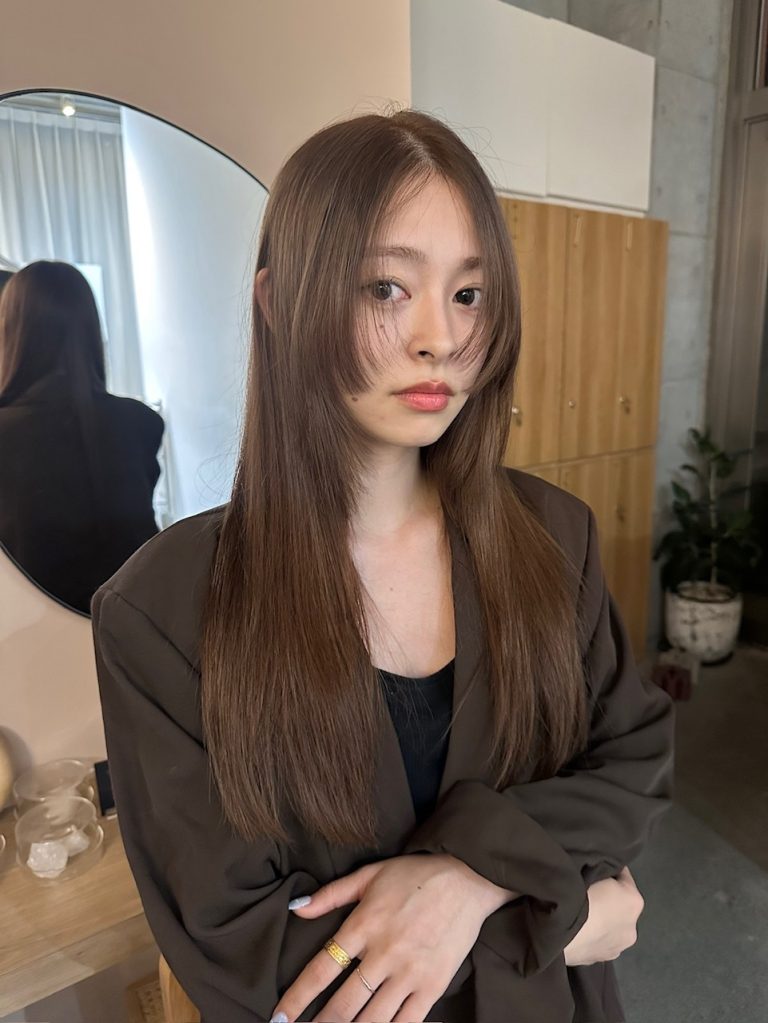 ①ざっくりと斜めに分け取り、左側は耳下でくるりんぱ。