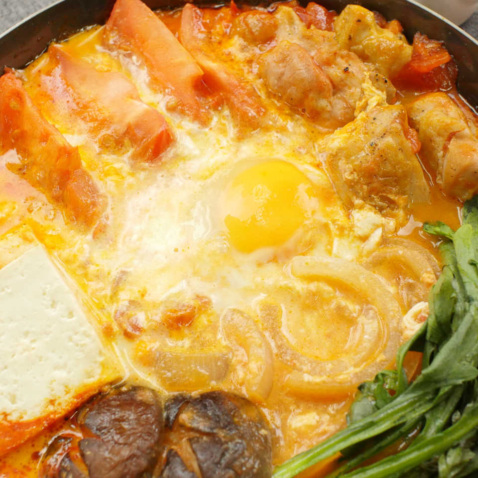 冬の団らんといえばすき焼き!いつものすき焼きにトマトでひと工夫、トマすきを作ってみませんか♩鶏もも肉と野菜をグツグツ、そこにモッツァレラチーズを投入!アツアツとろ〜り、たまらない新感覚のすき焼き鍋の完成です。