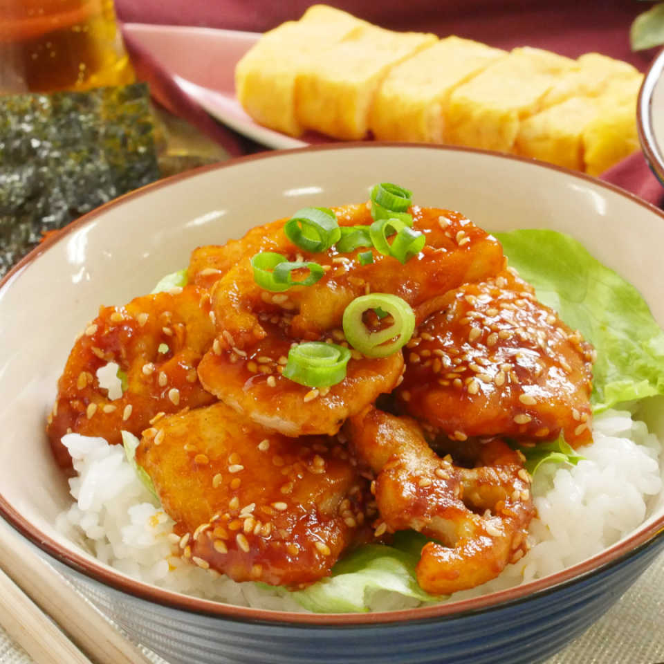 やみつき韓国めし「ヤンニョム風甘辛チキン丼」のレシピをご紹介します!鶏肉にコチュジャンが効いた甘辛の濃厚タレをたっぷり絡ませたら、どーんと白米にのせてめしあがれ!B級グルメ感満載のお箸が進むひと品です。