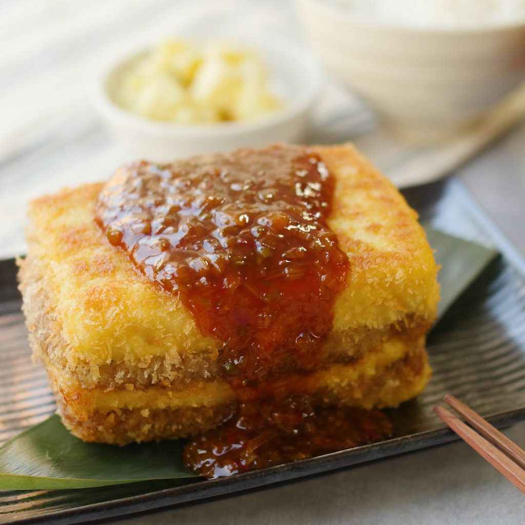 「麻婆だれのミルフィーユ豆腐かつ」のレシピと作り方を動画でご紹介。ミルフィーユカツに豆腐を使い、衣を付けてさっくりと揚げました。ジューシーなお豆腐と豚肉が食べ応え満点!長ねぎ入りのピリ辛麻婆だれをたっぷりかけて召し上がれ♪