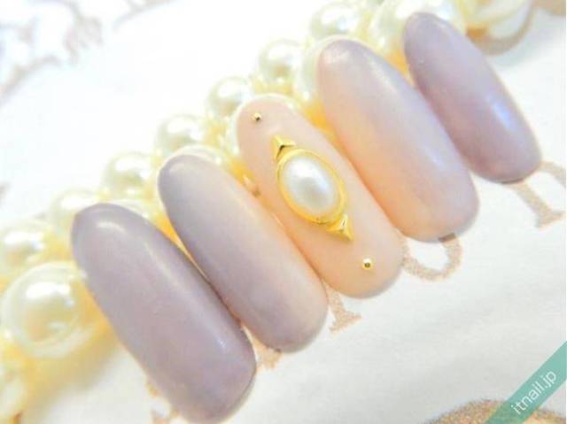 この春のNo.1トレンドカラー“ラベンダー”。全体に塗るとオフィスでは浮くので、フレンチで取り入れるのが吉。ベースのピンク色とも相性が良いのでバランスよく仕上がっています。