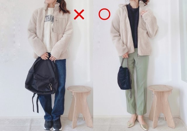 スタイルアップしたいならスキニーパンツを選びましょう。「だぼっとカーデ」のボリューム感と差がついて下半身をより細く見せてくれます。