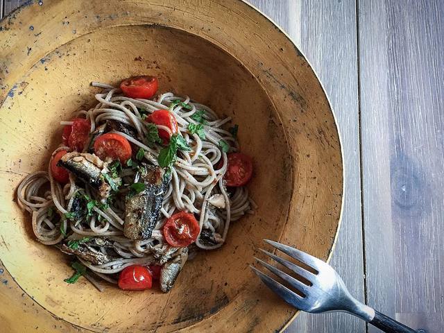 ⑥色が変わったら、せりを加えて反対側にも火を通す。