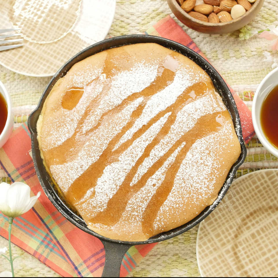 材料たったの4つでできる「ぐりとぐらのカステラ」のレシピをご紹介します。ハンドミキサーがなくても、ある裏技で簡単に素早くメレンゲを作ることができるんですよ!スキレットで生地を焼いたら、絵本から飛び出したような、ふわふわカステラの完成です!