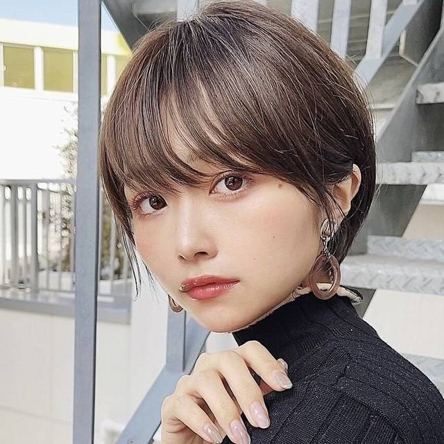 ショートヘアはボーイッシュになりがちですが、リップバングをプラスするといい女感がアップします。ふんわりひし形フォルムで小顔効果も抜群です!