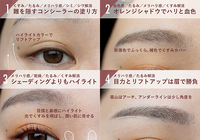 やつれて見えるのを防ぐには、パール入りのチークをチョイスすること。自然な立体感を出せます。