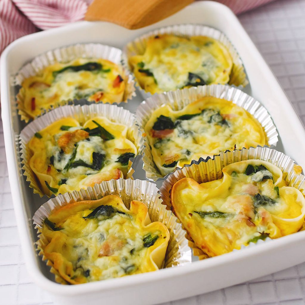 「ほうれん草とベーコンのカップキッシュ」のレシピと作り方を動画でご紹介します。餃子の皮を使うと簡単にお弁当サイズのキッシュが作れます。作り置きとして活用できるのでとっても便利ですよ!食べる際は温めて召し上がってくださいね♪