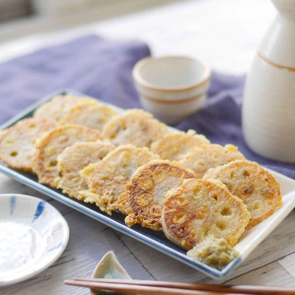 1. れんこんは皮をむき、4mm幅の薄切りにします。