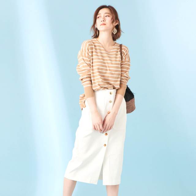 定番のボーダートップスにコットンリネンのギャザースカートを合わせた、ナチュラル&カジュアルな春コーデ。明るいビタミンカラーのオレンジが元気を与えてくれる、アクティブなスタイルです。