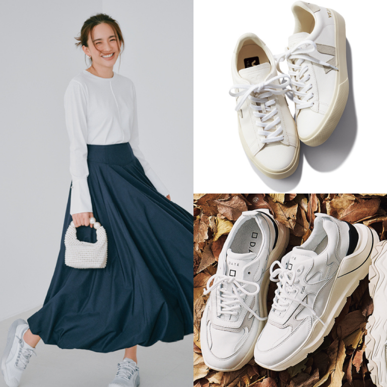 足元は白とマスタードの中間をとったベージュ靴で、バランスを整えると美しいレディースコーデに。