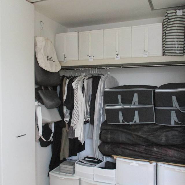 使う頻度の高いものをまとめたリビングクローゼット。カラーボックスや収納ケース、突っ張り式の棚などを利用して、縦・奥行の空間を無駄なく上手に使っているのが分かります。