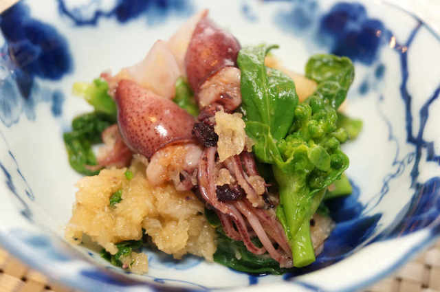 みずみずしい菜の花とぷりっぷりのホタルイカに、春の訪れを感じる一品です。嚙みしめるたびに口に広がる、菜の花の独特の苦みとホタルイカの旨み。大根おろしがしっかりと絡まり、全体の味わいをまとめてくれています。お好みで辛味大根をおろしても、より一層大人の風味に。