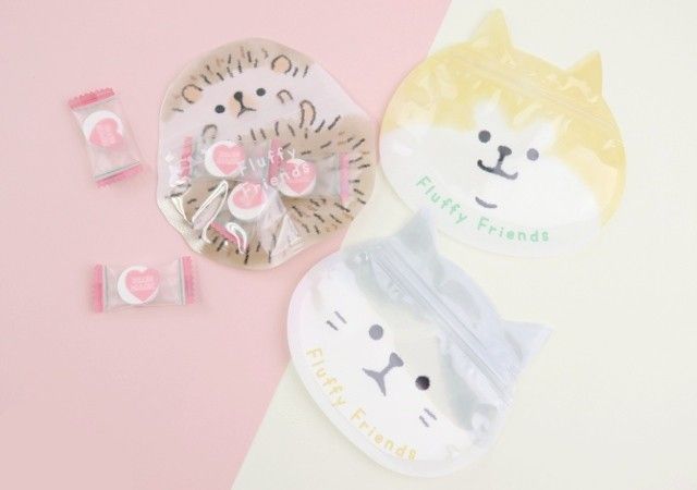 まるでキャニスターに入れているかのような自立するジッパーバッグです。食品、お菓子はもちろん、ヘアアクセや薬などを入れてもOKです。左からL3枚入り、M3枚入り、S5枚入りで各100円(税抜)です。