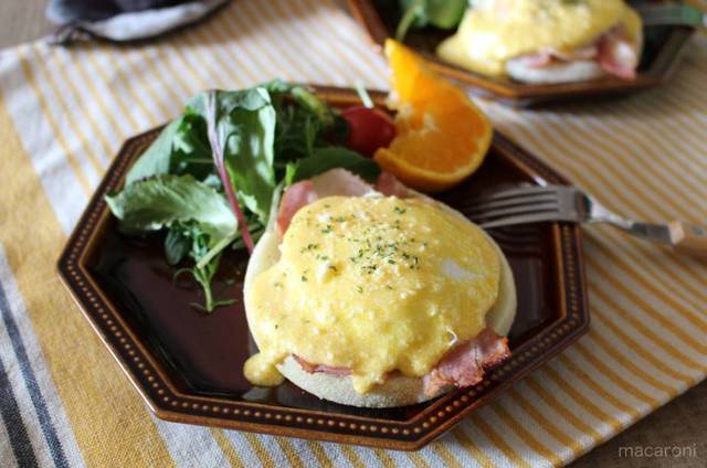 「エッグベネディクト」とは、イングリッシュマフィンにハムまたはベーコンとポーチドエッグをのせ、オランデーズソースをかけた料理。