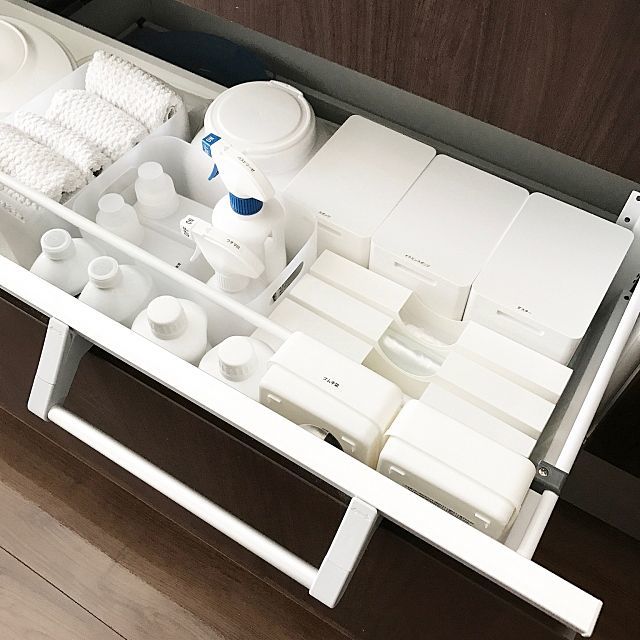 引き出し収納をリーズナブルに抑えたい方は、100均アイテムを活用してみてはいかがでしょう?「フタ付きボックス」や「キッチン消耗品収納ケース」を上手に使えば、このとおりすっきり収納できますよ♪