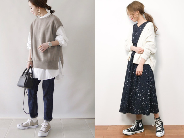 今年大流行のトレンチスカートにも、もちろんスニーカーは相性抜群。デザイン性の高いスカートにも、定番のコンバースならすんなりマッチしてくれますね。