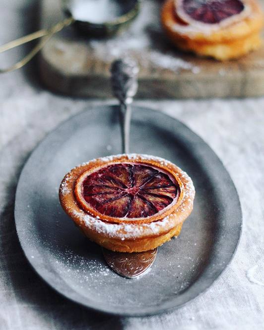 ブラッドオレンジのスライスを大胆に配置したミニチーズケーキに合わせているのは、陶芸家・吉田次朗さんの器。「落ち着いたグレーのカラーリングやマットな質感、無機質な風合いが料理やスイーツをいきいきと引き立たせてくれるんです」とshimaさん。