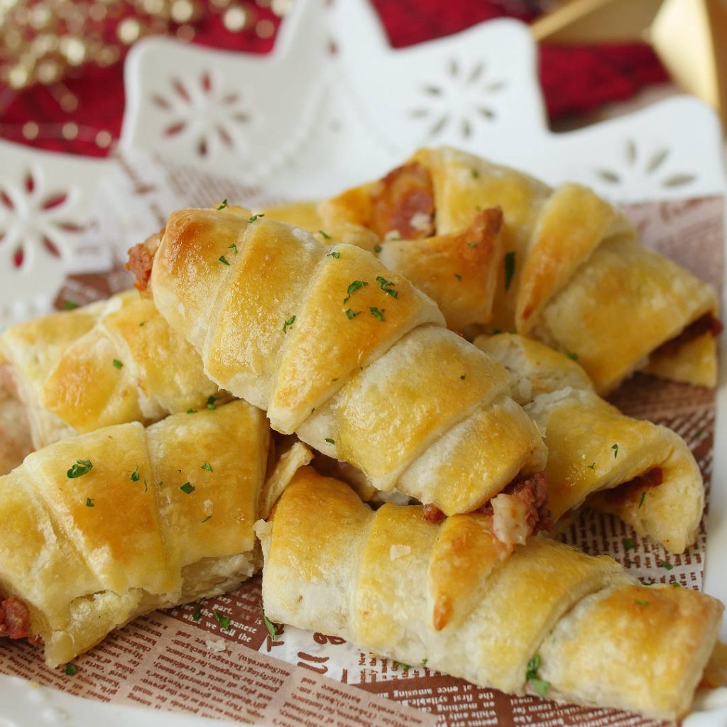 「ミートクロワッサン」のレシピと作り方を動画でご紹介します。パイシートを三角に切り、ミートソースとモッツァレラチーズを巻いてトースターでさっくり焼きました。簡単なのにとってもかわいいフィンガーフードは、パーティーや手土産にもぴったりです♪