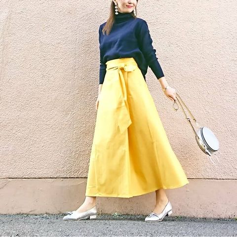 トップスにネイビーニットのシンプルアイテムを合わせても、イエローのチノフレアマキシスカートを合わせるだけで、上質なコーデに。このスカート1枚でトレンドスタイルが叶います。