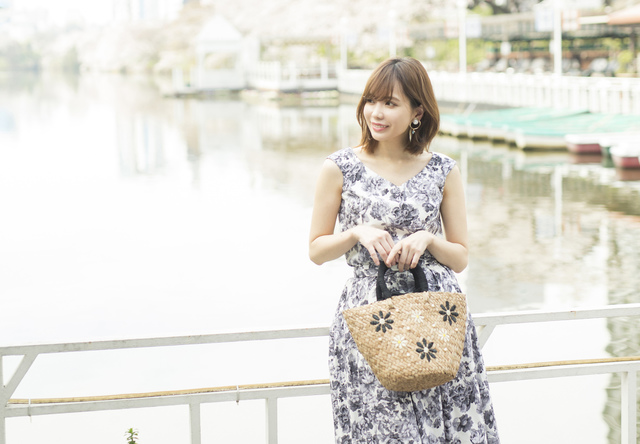 華やか花柄ワンピをシティリゾート風に。「ワンピがお出かけっぽいから普通のバッグだとリゾートすぎ。かっちりお嬢さんっぽい都会仕様のこれくらいのかごバッグがベストです。このワンピは胸元がV空きで短め丈、一枚でばっちりキマるから、女子会とか華やかな場にぜひ」(井関さん)