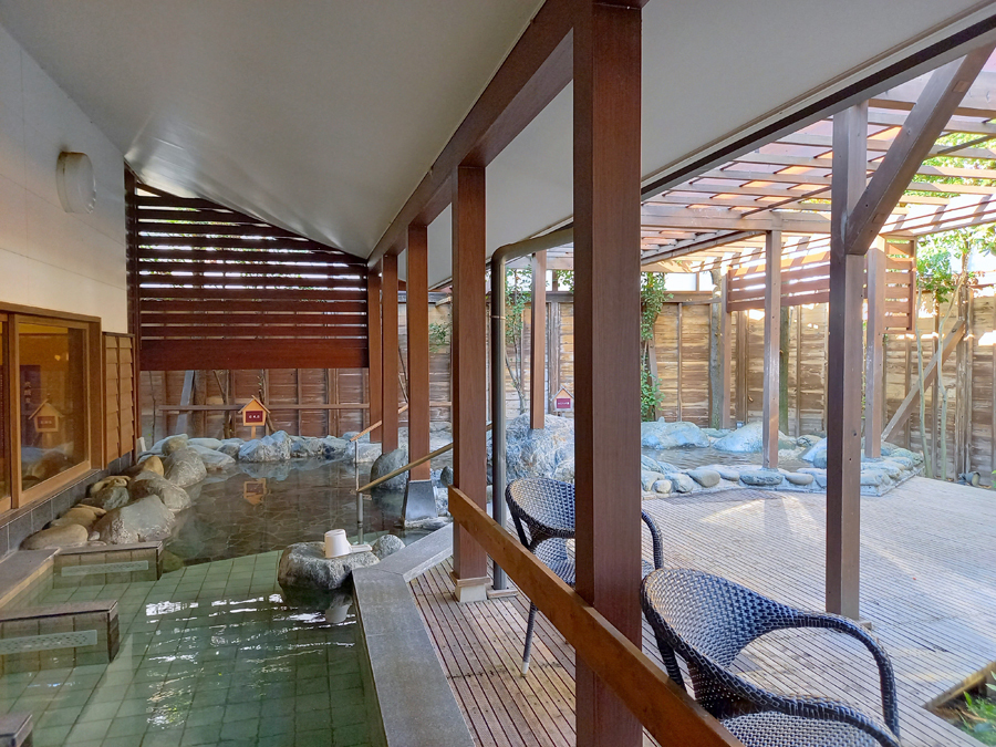 露天エリアは屋根の構造部だけ組んだような造りになっていて、陽射しが程よく降り注ぐ空間。「岩風呂」「ねころび湯」「美泡壺湯」「電気風呂」といった多彩なお湯が楽しめます。
