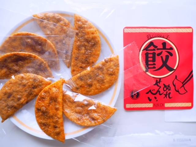 こちらが断面図!ふつうのおせんべいで、中に具は入っていないですね。しっかり味付けされた餃子を、さらにおいしいつけダレにつけたような味。ご飯にも合いそうです。