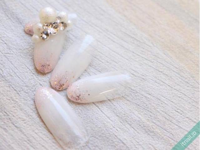 透け感のあるココアカラーは、乳白色と合わせてフェミニンな印象に。まろやかさがアップしてより柔らかい空気感をまとうことができます。根元にひいたラメラインは全体のバランスを引き締めて、きちんとした印象も引き立ててくれます。