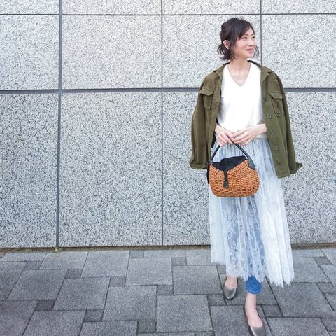 甘めコーデに程よく辛さをプラスしてくれるミリタリージャケット。流行に左右されにくく、毎年定番で着こなせるアイテムなので、1着持っていて損はありません。さらりと肩掛けするだけで、こなれコーデが完成します。