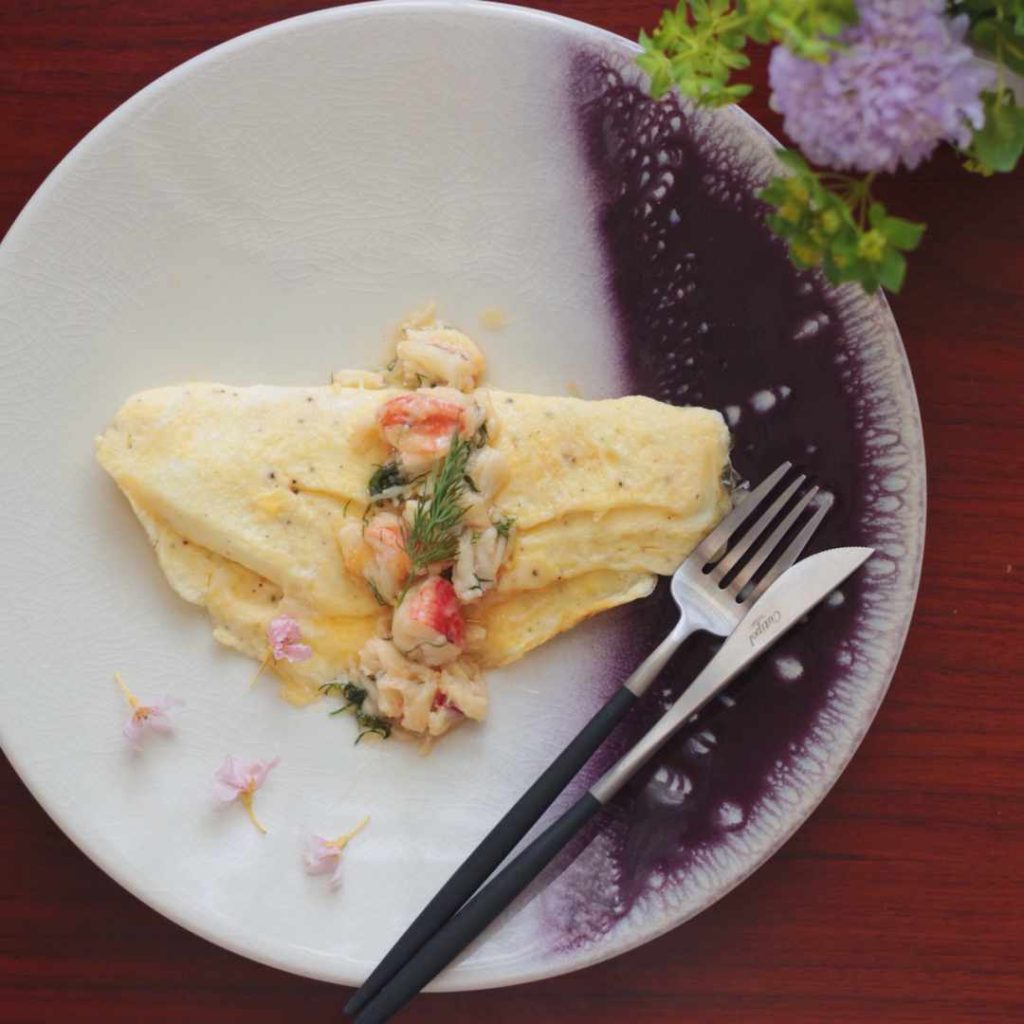 「かにの味噌バターオムレツ」のレシピと作り方を動画でご紹介します。ふわふわ卵にかにの身と白みそを合わせたソースをたっぷりとかけて、リッチなオムレツに仕上げました。パープルのプレートに映える、休日の朝食やブランチにピッタリなひと品です。