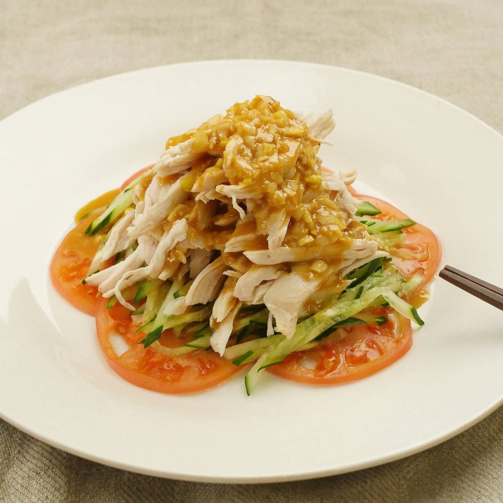 5. 器に③の鶏肉をのせ、④をたっぷりかけて召し上がれ!お好みでトマトときゅうりを敷いてくださいね。